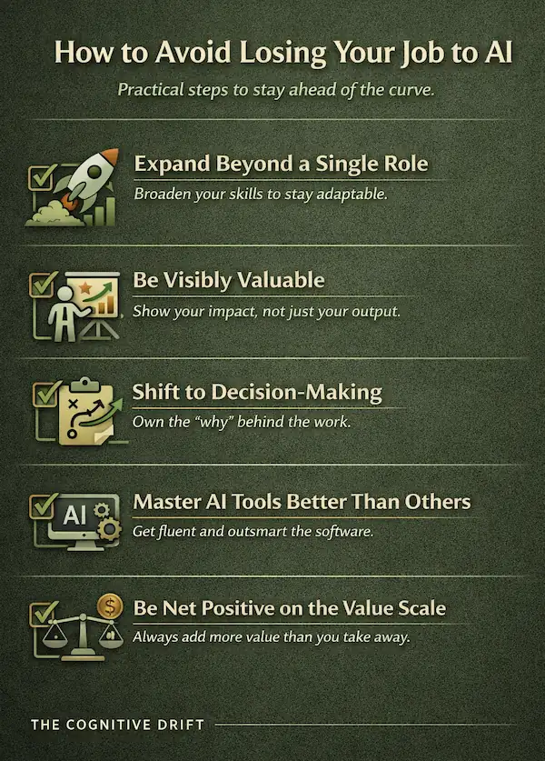 The safest move now isn’t to work harder or longer, but to move up the value chain toward judgment, creativity, and ownership—where humans still win.